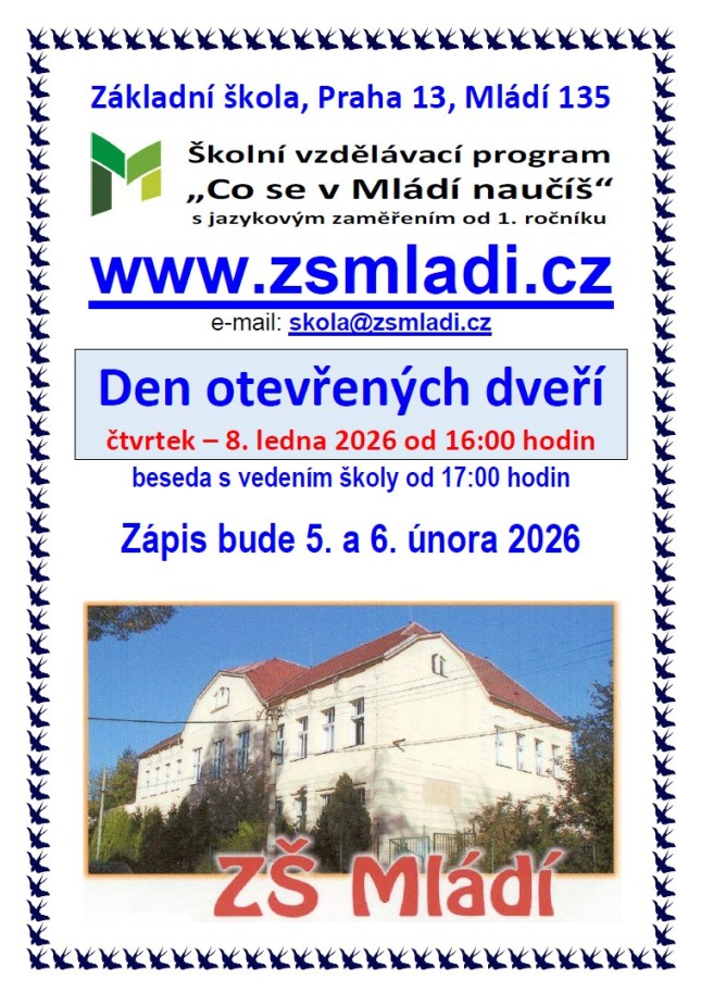 Den otevřených dveří se bude konat ve čtvrtek 8. ledna 2026 od 16:00 do 18:00 hodin.