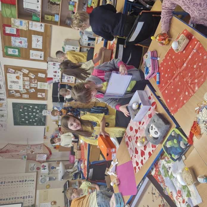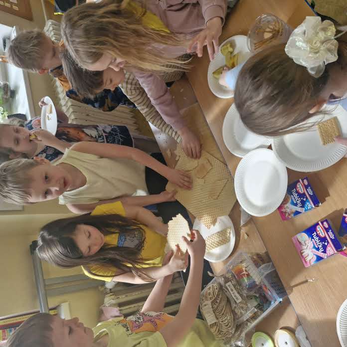 Další část dne patřila tvořivým aktivitám. V centrech si žáci vyzkoušeli různé techniky a činnosti – vytvořili si malovaná velikonoční vajíčka pomocí netradiční krabicové malby s využitím akrylových barev, vyráběli zápichy, procvičovali jemnou motoriku při vyšívání tupou jehlou do dřevěné šablony zajíčka a zdobili si vlastní sušenky z připravených korpusů pomocí čokolády a jedlého zdobení.