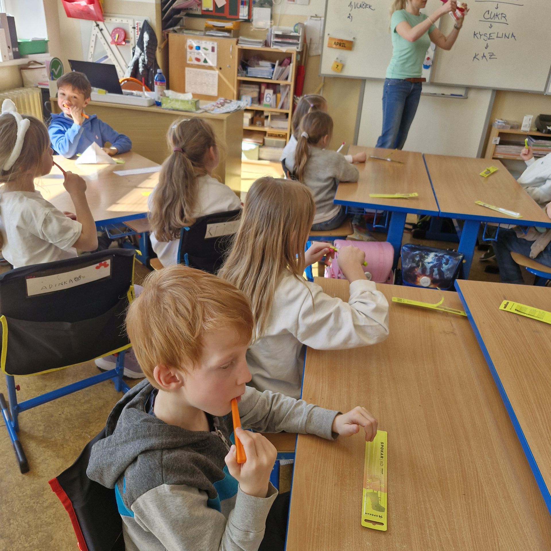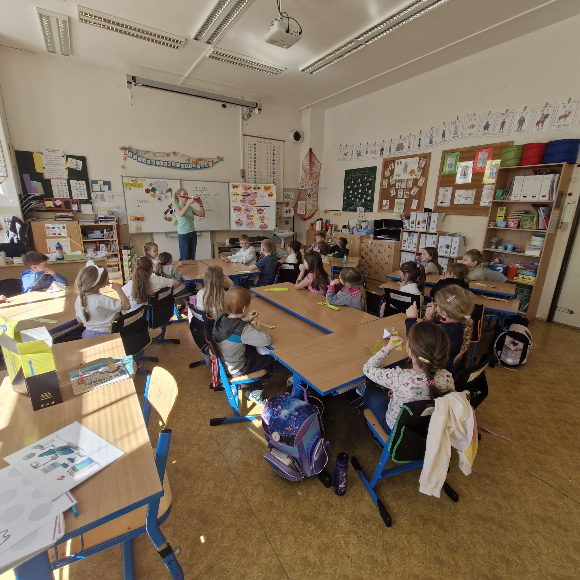 Začátkem dubna 1. třídy navštívila dentální hygienistka, která dětem poutavou formou přiblížila, jak správně pečovat o své zuby. Povídali jsme si o tom, jak zuby vypadají před a po jídle, co jim škodí, a naopak co jim prospívá.