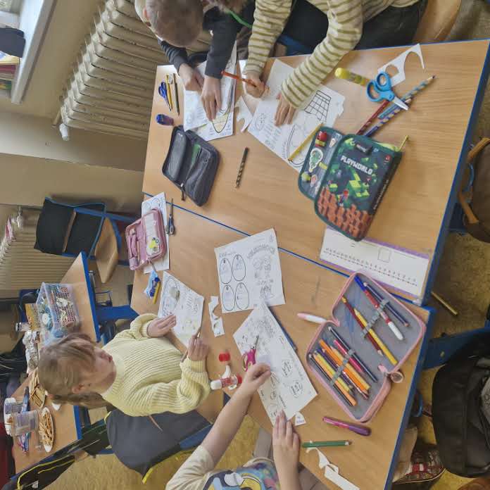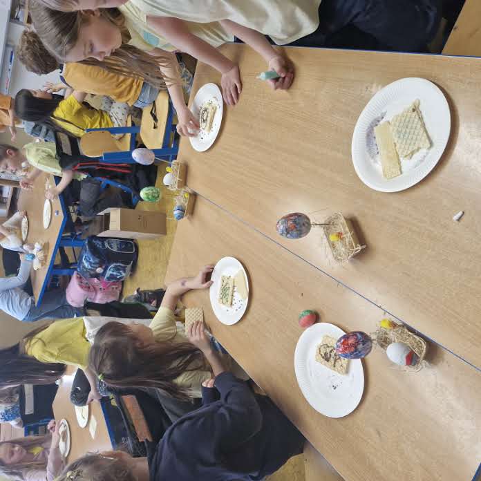 Další část dne patřila tvořivým aktivitám. V centrech si žáci vyzkoušeli různé techniky a činnosti – vytvořili si malovaná velikonoční vajíčka pomocí netradiční krabicové malby s využitím akrylových barev, vyráběli zápichy, procvičovali jemnou motoriku při vyšívání tupou jehlou do dřevěné šablony zajíčka a zdobili si vlastní sušenky z připravených korpusů pomocí čokolády a jedlého zdobení.