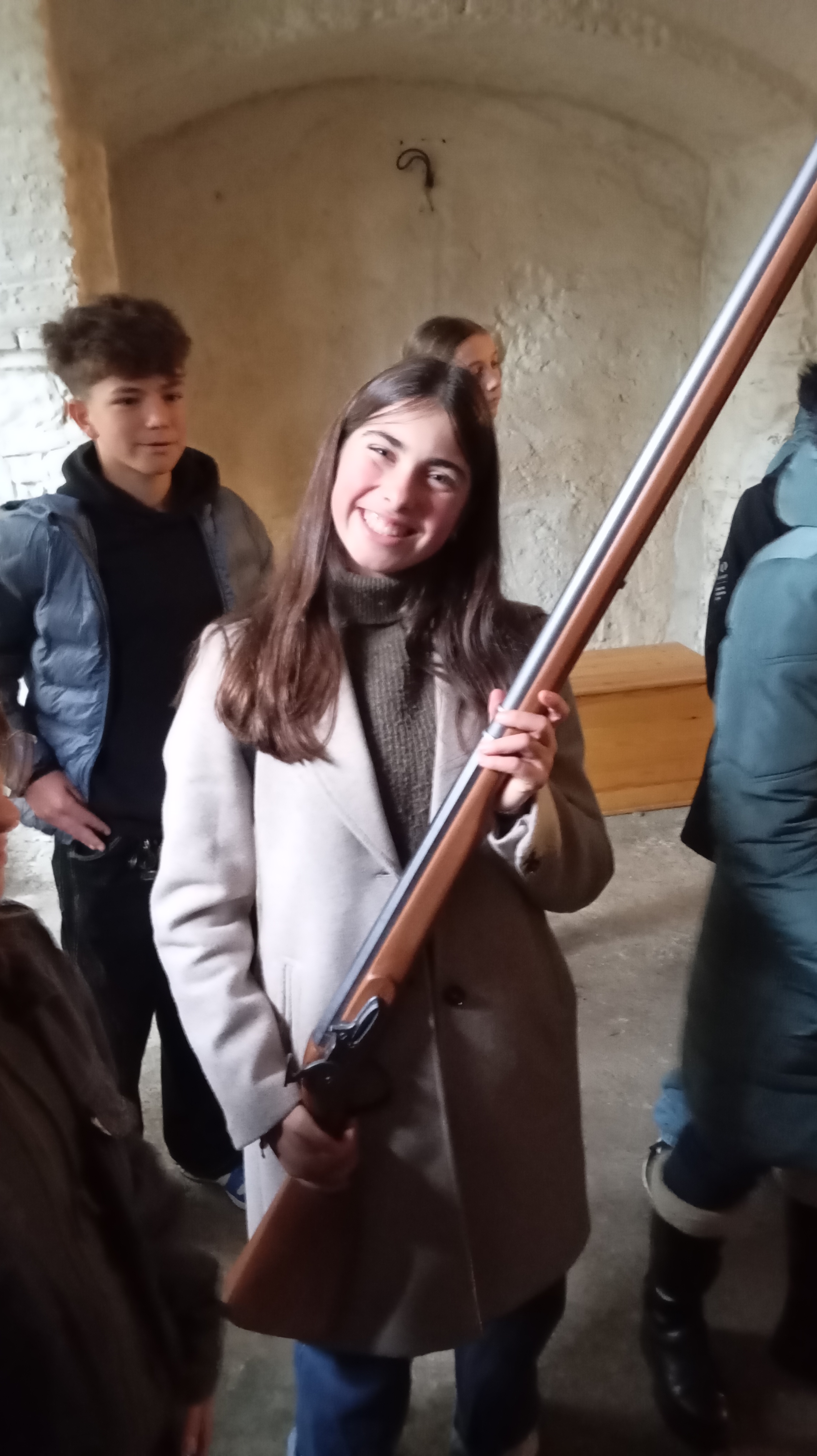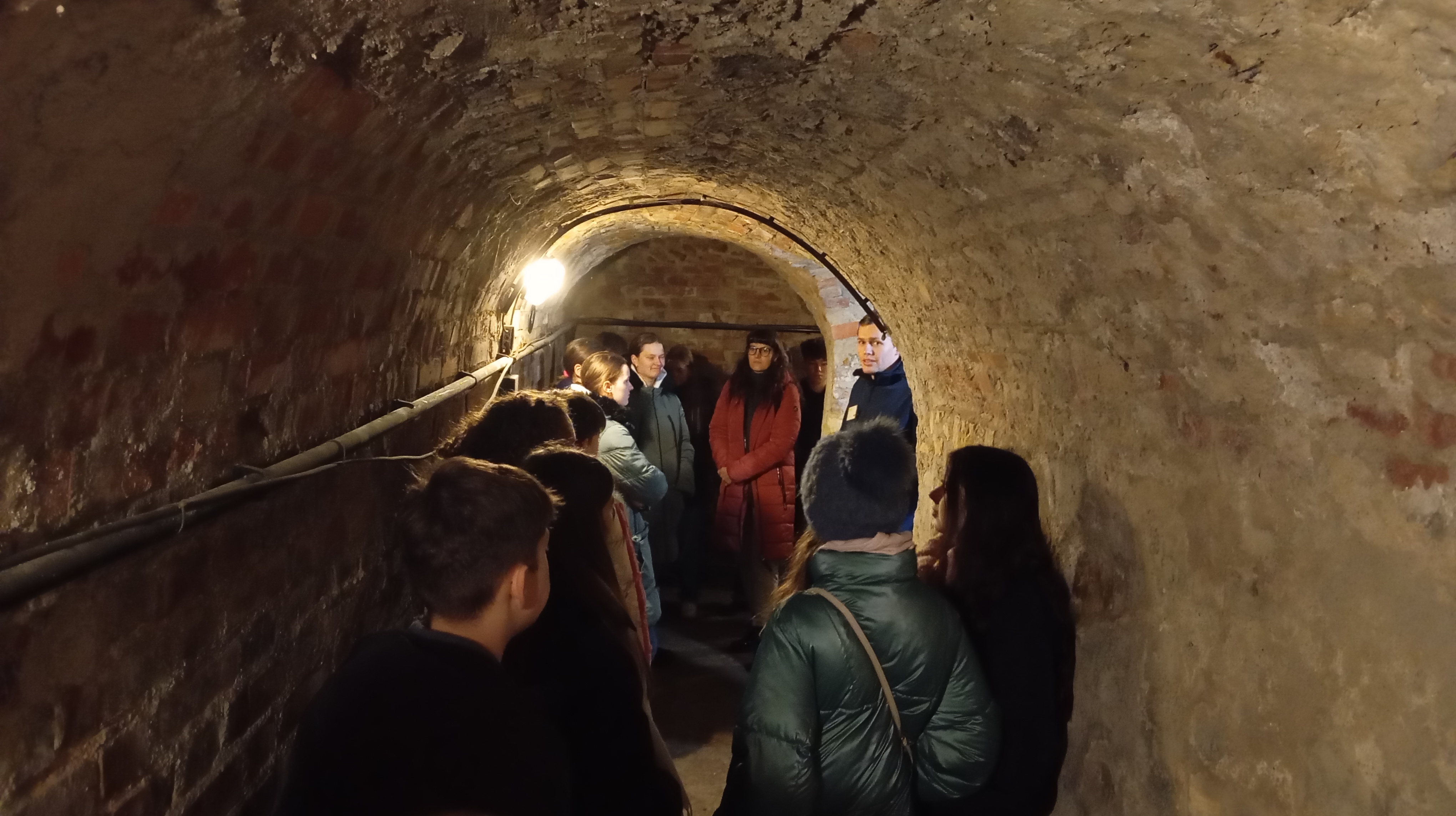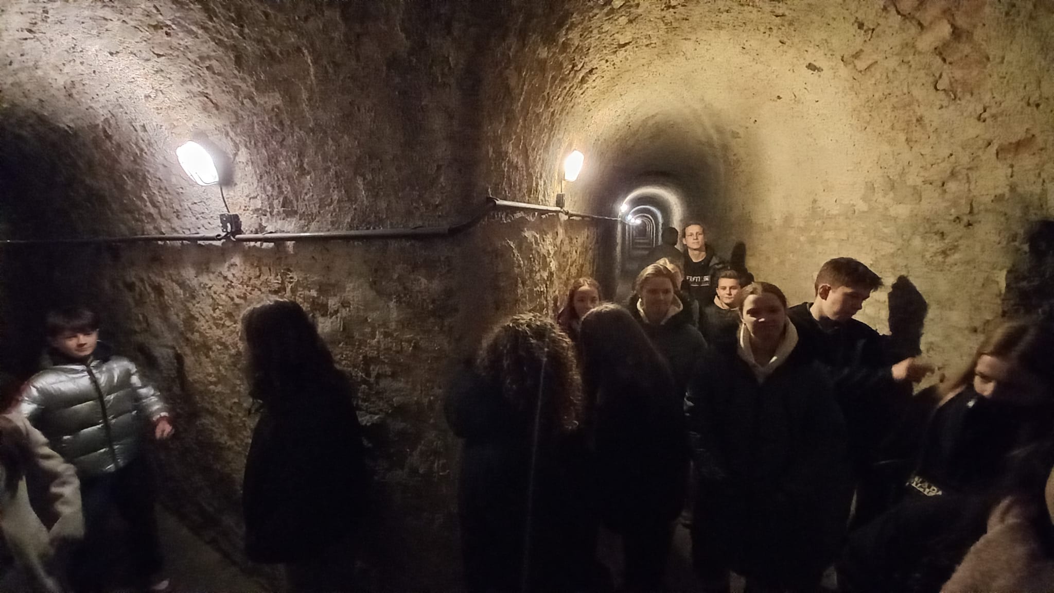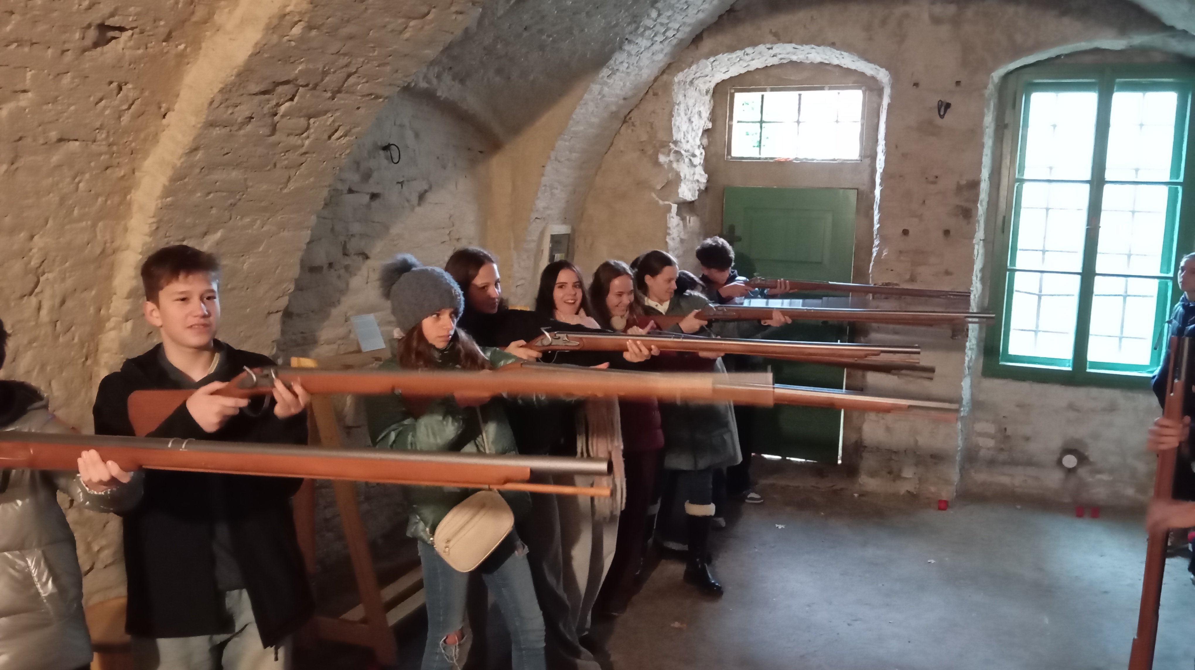 Osmačky a osmáci viděli majestátní pevnost nejen z venku, ale pan průvodce nám ukázal i její vnitřní chodby – kasematy. Žákyně a žáci si vyzkoušeli, jaké je nabíjet muškety s křesadlovými zámky, stát pod vysokým valem v pevnostním příkopu, prohlédli si rohy bastionů, prošli několika bránami, viděli pevnostní kostel, mnohem starší rotundu sv. Martina a hlavně prolezli značnou částí Martinských kasemat. Ty jsou sice od dob nacistů osvětlené elektrickým osvětlením, to ale v 18. stol. neexistovalo. Tehdy se vojáci museli orientovat v naprosto temných tunelech jen za pomoci několika paprsků světla dopadajícího skrze větrací šachty – i to nás pan průvodce nechal vyzkoušet a zvládli jsme to statečně!